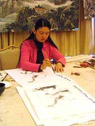 十二月二十九日,在“紀(jì)念人民藝術(shù)家齊白石誕辰一百四十周年全國(guó)書(shū)畫(huà)萬(wàn)里行”廣州站的展覽、筆會(huì)活動(dòng)上,藝術(shù)大師齊白石孫女齊慧娟面向廣州市民即席揮毫作畫(huà)。作者:郭軍
