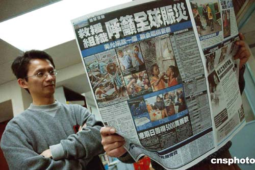 香港報(bào)刊報(bào)導(dǎo);南亞海嘯世紀(jì)大災(zāi)難首次傳來港人死訊,1名39歲香港男子證實(shí)在泰國(guó)布吉死亡,在這次災(zāi)難中,另有213港人失去聯(lián)絡(luò)。12月 29日上午,市民閱讀當(dāng)天新聞密切關(guān)注有關(guān)消息。作者:洪少葵