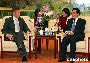 國(guó)家主席胡錦濤五月十四日在北京會(huì)見(jiàn)新加坡副總理李顯龍。中新社記者:滿(mǎn)會(huì)喬