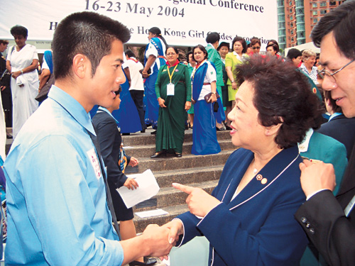 中新網(wǎng)5月18日電 據(jù)香港大公報(bào)報(bào)道,作為今年的女童軍國(guó)際親善大使,郭富城昨日應(yīng)邀出席女童軍“第八屆亞洲太平洋區(qū)會(huì)議”,同場(chǎng)的還有特首夫人董趙洪娉女士;顒(dòng)期間,“城城”和董太不時(shí)交談,原來(lái)董太想邀請(qǐng)他出席一些公益活動(dòng),希望他可以幫手。