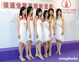 《2004年度香港小姐競(jìng)選》5月18日在香港舉行記者會(huì),十八位候選佳麗首度會(huì)晤傳媒。圖為1---6號(hào)候選佳麗:朱慧敏、余妍慧、毛嘉欣、鄧慧琦、楊施詩(shī)、徐子珊(左起)。作者:鄧慶樂(lè)