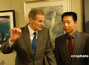 當(dāng)?shù)貢r(shí)間五月二十日下午,中國(guó)首飛航天員楊利偉在華盛頓拜會(huì)美國(guó)上世紀(jì)八十年代的航天員、現(xiàn)任國(guó)會(huì)參議員比爾·納爾遜,兩人展開了真誠(chéng)而幽默的對(duì)話。中新社記者:余東暉