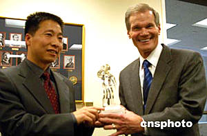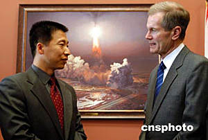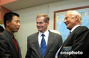 中國首位進(jìn)入太空飛行的宇航員楊利偉今天下午在華盛頓會(huì)晤美國上世紀(jì)八十年代的宇航員、現(xiàn)在的國會(huì)參議員比爾·納爾遜。
