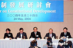 香港政制發(fā)展專責小組委托中央政組,于5月24日在會展中心舉辦首場政制發(fā)展研討會,主題為專責小組發(fā)表的第三號報告書中,有關2007年行政長官及2008年立法會產生辦法可考慮修改地方。 地方。作者:洪少葵