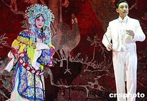 為紀(jì)念中國最著名的京劇大師梅蘭芳先生誕辰一百一十周年,北京京劇院演出的京劇大型交響劇詩《梅蘭芳》五月二十五日晚走進北京大學(xué)百年講堂,如詩如畫的舞臺設(shè)計和京劇藝術(shù)家們精湛的演技贏得大學(xué)生的陣陣喝彩。京劇大型交響劇詩《梅蘭芳》擷取了抗日戰(zhàn)爭期間梅蘭芳蓄須明志,拒絕為日本人演出的人生片段。圖為由北京京劇院于魁智(右)扮演的梅蘭芳先生。中新社記者:張勤