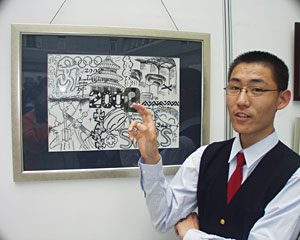 記者在展覽上看到,在寬敞的大廳內(nèi),擺滿了學(xué)生創(chuàng)作的作品,包括版畫、民間剪紙、刮畫、紙雕、面具、漫畫、海報、中國結(jié)等十多種,內(nèi)容涉及更廣,如環(huán)保、奧運會、行為規(guī)范、國慶等。十四歲的葛雅靜,看上去十分靦腆。這次展覽她如魚得水,有五幅作品入選,是所有參展學(xué)生最多的。她的刮畫極富想象力豐富,吸引觀者駐足。據(jù)她說,父母都不是從事藝術(shù)工作的,她是上藝術(shù)課上后,逐漸發(fā)現(xiàn)自己愛上畫畫了。