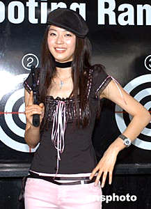 韓國(guó)電影《野蠻師姐》女主角全智賢5月27日在香港元朗流浮山警署為電影宣傳造勢(shì),手持左輪手槍一展“師姐”風(fēng)范。作者:鄧慶樂