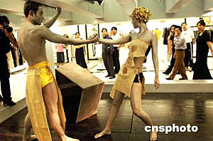 五月二十八日,地處“京西經(jīng)濟(jì)帶”核心地區(qū)的“北京華宇時(shí)尚購(gòu)物中心”開業(yè),兩位藝人現(xiàn)場(chǎng)進(jìn)行人體藝術(shù)表演,為商廈造勢(shì)。中新社記者:鄒憲
