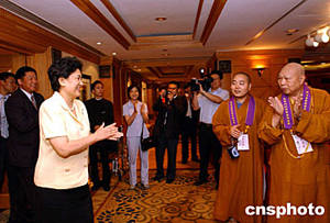 全國政協(xié)副主席、中央統(tǒng)戰(zhàn)部部長劉延?xùn)|,5月28日在下榻酒店會見一誠法師等佛指舍利赴港護(hù)送團(tuán)成員。作者:洪少葵