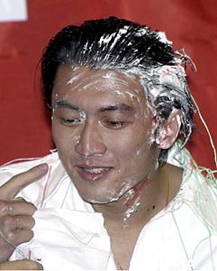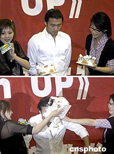 五月二十九日晚,在美卡音像為謝霆鋒新專輯《LISTEN UP》熱賣舉行的慶功會上,謝霆鋒毫無防備被工作人員準(zhǔn)備的雙份蛋糕“擊中”全臉,頓失俊朗形象。中新社記者:高遠(yuǎn)