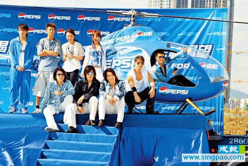 在直升機(jī)場(chǎng)上,先安排九位巨星為“百事”小型直升機(jī)進(jìn)行揭幕儀式,又與直升機(jī)合照!俺浅恰弊R(shí)搶位,第一時(shí)間沖入直升機(jī)坐上機(jī)師位,其它巨星就只是在飛機(jī)旁合照。