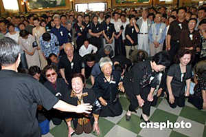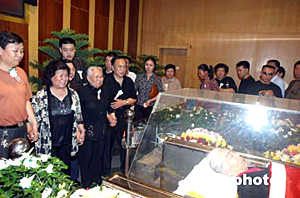 在鄭州市殯儀館內(nèi),記者看到,躺在鮮花叢中的常老是那樣的安詳。鮮花簇?fù)淼撵`柩上,覆蓋著一面鮮紅的中共黨旗。靈柩上方,黑紗環(huán)繞著常香玉的照片——花白頭發(fā),寬邊眼鏡,大紅毛衣外罩,端莊慈祥寧靜的笑容,一派優(yōu)雅。雖然其親屬根據(jù)常老的遺愿盡量使儀式簡樸,然而前往吊唁的各界人士一度達到幾千人,整個儀式大廳被圍了個水泄不通。