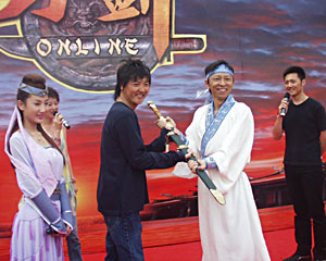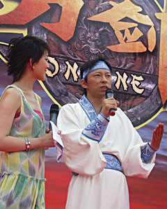 在象征著中國龍的居庸關(guān)長城腳下,上千位手持搜狐“群英帖”的嘉賓匯集一堂,儼然一場名副其實的江湖群英會!兜秳nline》發(fā)布會以氣勢恢弘的舞龍開場,代表著《刀劍Online》將在群雄逐鹿的網(wǎng)游市場,以原汁原味的中國功夫開篇中國人自己的網(wǎng)游傳奇!八押崎T人”張朝陽一身古代俠士裝扮出場,一番刀劍揮舞,顯示了不凡的武功造詣。而作為此款網(wǎng)游主題音樂代言人的內(nèi)地著名歌手孫楠則以一曲曲風(fēng)高揚,極具武俠風(fēng)格的《刀劍》將發(fā)布會氣氛推向高潮。
