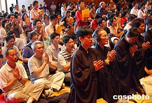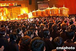 閉幕典禮前,香港佛教界還舉辦了隆重莊嚴(yán)的“圓滿傳供”禮佛儀式。約四千名佛教徒身著法衣,跪拜佛前,在悠揚(yáng)的念佛聲中,依序?qū)ⅰ跋恪薄ⅰ盎ā、“燈”、“果”、“荼”、“食”等供品傳遞到供奉著佛指舍利和三寶佛的禮臺上,以感念佛陀恩澤,并表達(dá)對佛陀的最高敬意。整個儀式長達(dá)兩個多小時。