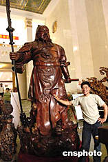 六月在北京民族文化宮舉辦的首屆中國(guó)民間工藝品博覽會(huì)上,一尊大型紫花梨木雕像“九龍關(guān)公”令人嘆為觀止。該雕像高三點(diǎn)二米,加上佩刀總高三點(diǎn)六六米,重三噸,是用四點(diǎn)二米高的梨木制成。該雕像作品由沈陽(yáng)根雕藝術(shù)家劉家鵬、趙維強(qiáng)(圖)和劉自豪歷經(jīng)三年制作而成。中新社記者:鄒憲