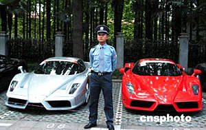六月五日,一位保安在兩輛頂級恩佐·法拉利GT跑車前執(zhí)勤。七十多輛來自中國內(nèi)地、中國香港和日本等地的法拉利和瑪莎拉蒂跑車齊聚上海,慶祝剛剛通過國際汽聯(lián)驗(yàn)收的上海國際賽車場正式啟用。作者:王麗南