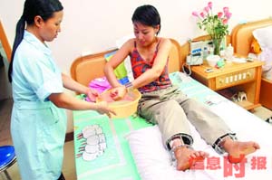 管小姐手拿著一把扳手,一絲不茍地?cái)Q著套在腳上的螺絲,極像一個(gè)修理機(jī)器的工人。擰完螺絲之后,又在醫(yī)生護(hù)士的扶助下,握著腳手架在房間里來回移動(dòng)。據(jù)管小姐介紹,手術(shù)的第二天,她就把身上的鎮(zhèn)痛棒拆除了。但是腳部仍然無法動(dòng)彈,幾天來一直只能躺在病床上,腳部總感到脹痛,尤其是晚上翻身時(shí),膝部總感到一股鉆心的疼痛。現(xiàn)在每天要打一次消炎針和喝一碗骨頭湯。“很多人都想知道她手術(shù)后想找一個(gè)什么樣的男友,而我從來就沒有想過,如果對(duì)一個(gè)打工仔有感覺,也會(huì)嫁給他。”管小姐坦言道。