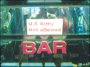 一些酒吧的老板也承認(rèn)這樣做帶有歧視色彩,但除此之外他們也沒有別的辦法。他們必須在警察趕到前制止打架,否則酒吧就會(huì)被關(guān)閉。在采取不讓美國大兵進(jìn)酒吧的政策后,酒吧現(xiàn)在不再有麻煩了。