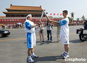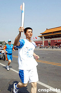 六月九日,二○○四年雅典奧運(yùn)火炬北京接力活動(dòng)在人民大會堂東門外廣場啟動(dòng),該火炬將經(jīng)過一百四十八名火炬手傳遞五十五公里到達(dá)終點(diǎn)頤和園。十九歲的武警國旗護(hù)衛(wèi)隊(duì)?wèi)?zhàn)士阮野接過第二棒火炬從天安門前跑過。中新社記者:鄭萍萍
