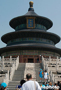 六月九日上午九時(shí),二○○四年雅典奧運(yùn)會火炬北京傳遞活動(dòng)從北京人民大會堂東門外廣場開始,經(jīng)過一百四十八名火炬手傳遞,最后到達(dá)頤和園。圖為游泳名將羅雪娟手持奧運(yùn)火炬抵達(dá)天壇祈年殿。中新社記者:張宇
