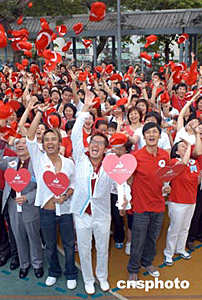 歌星譚詠麟、李克勤、余文樂6月9日在香港出席義務(wù)工作發(fā)展局舉行《全民義工參與賣旗日‧榮譽(yù)義工大使委任儀式》,三位榮譽(yù)義工大使聯(lián)同上百義工齊聲高呼「凝聚義工力量,發(fā)放愛心光芒」口號。