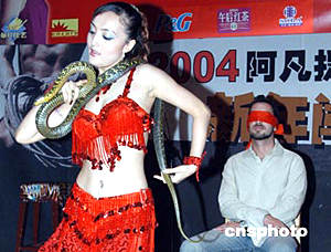 二○○四年六月上旬,在北京一家民族風味餐廳里,前來用餐的顧客被邀參加互動表演蛇舞,讓顧客在享用美食的同時大飽眼福。中新社記者:張宇