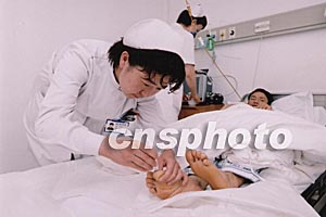 在阿富汗恐怖襲擊事件中受傷回國治療的四名中國工人住進山東省立醫(yī)院后,受到了醫(yī)護人員無微不至的關(guān)懷。圖為山東省立醫(yī)院護士在為傷員席守忠修剪腳趾甲。中新社記者:張偉