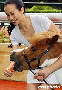 香港賽馬會(huì)六月十七日在跑馬地馬場(chǎng)舉行“2003/2004香港賽馬會(huì)冠軍人馬頒獎(jiǎng)典禮”打氣活動(dòng),歌星莫文蔚興致勃勃向可愛的雪特蘭小馬喂食紅蘿。中新社記者:錢興強(qiáng)
