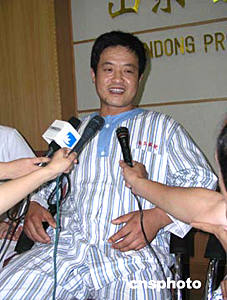 因阿富汗恐怖襲擊事件受傷的四位人員中的兩位輕傷者蔣昌泉和王金生,六月二十二日在山東省立醫(yī)院與各路媒體見面。經(jīng)過醫(yī)院醫(yī)護(hù)人員七天的精心治療和細(xì)心護(hù)理,兩人基本痊愈。圖為山東諸城的受傷工人王金生。作者:胡洪林