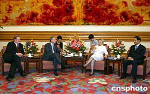 中國國務(wù)院副總理吳儀六月二十三日在北京中南海會見來訪的美國商務(wù)部長埃文斯。會談中,吳儀副總理指著自己穿的衣服和鞋子說,這些都是美國產(chǎn)品,也算是為縮小中美貿(mào)易逆差做貢獻,幽默的語言引來現(xiàn)場一片歡笑。中新社記者:毛建軍