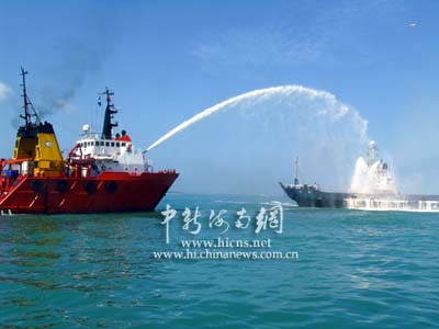此時(shí),觀摩演習(xí)的人們發(fā)現(xiàn),在出事船只周圍,已經(jīng)有多條各類救助船開始行動(dòng),中國救助船“南鷹”輪和“南海救一六八”輪一左一右向燃燒著的遇難船只進(jìn)行壓制性滅火。兩只泡沫槍和一只高壓水槍對準(zhǔn)海難船強(qiáng)制滅火。此時(shí)的場面蔚為壯觀,一只高壓水槍激起的水霧在熱帶陽光的照耀下出現(xiàn)了一道漂亮的彩虹。