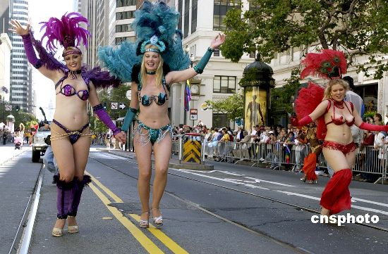 美國(guó)舊金山市六月二十七日舉行第三十四屆同性戀“自豪大游行”。圖為盛裝打扮的女子手拉手參加游行。陳鋼 攝
