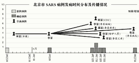 賀雄說,根據(jù)流行病學(xué)調(diào)查,可以判定,北京市發(fā)現(xiàn)的首例病例李某的傳染源為安徽非典患者宋某,隨后,李某又感染了自己的親屬和同病室病友,這個(gè)傳播鏈基本確定,即“首發(fā)病例宋某—李某—李某家庭及醫(yī)院傳播”。