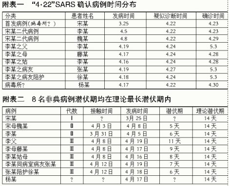 另外,賀雄介紹,以宋某為一代病例,從后續(xù)病例與前代最早接觸時(shí)間為暴露點(diǎn)開始計(jì)算,北京“4.22”SARS疫情中傳播鏈清晰的8名病例的潛伏期均在傳染性非典型肺炎理論最長潛伏期之內(nèi)。但首發(fā)病例宋某的接觸病毒時(shí)間和潛伏期尚無法推算;病毒病所博士生———患者楊某的接觸時(shí)間、傳播鏈位置和潛伏期亦存在疑問。