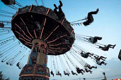 在玩刺激性游戲前,游客務(wù)必仔細(xì)閱讀游藝設(shè)備的警示牌,根據(jù)自己的身體狀況選擇項(xiàng)目。孩童類游戲如繞圈騎馬,3歲左右的兒童就可以玩。