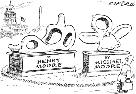 中新網(wǎng)7月5日電 約翰內(nèi)斯堡媒體Mail & Guardian近日刊登了這副漫畫,向讀者展示了兩件藝術(shù)作品:一個是邁克爾·摩爾的電影《華氏911》,一個是雕塑家亨利·摩爾的雕塑作品《沉睡中的女人》。