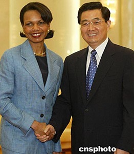 中國國家主席胡錦濤,七月九日在北京會見美國總統國家安全事務助理康多莉扎·賴斯。中新社記者:鄭萍萍