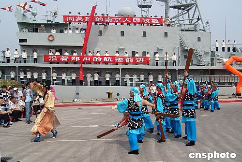中國海軍建造的第一艘遠(yuǎn)洋航海訓(xùn)練艦“鄭和”號(hào),七月十日抵達(dá)南京港龍?zhí)洞a頭,受到各界人士的熱烈歡迎。南京是鄭和下西洋的決策地,也是他長(zhǎng)期生活的地方,至今該市仍保存著許多有關(guān)鄭和的遺跡。王曉紅 攝