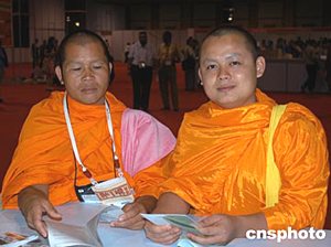 2004年7月初,兩位身著袈裟的泰國僧人,作為志愿者為第十五屆世界艾滋病大會會務(wù)服務(wù)。中新社記者:曾利明
