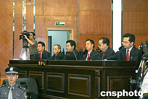 “一二·二三”特大井噴事故案今天上午九時三十分在重慶市第二中級人民法院開庭審理。圖為辯護人在法庭上。作者:鄒輝
