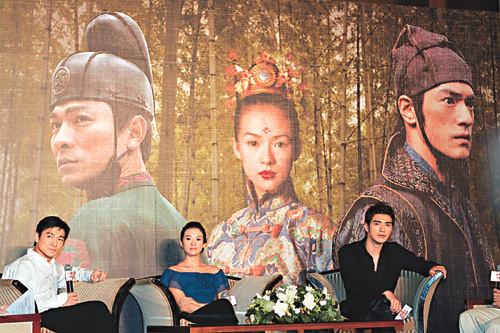 中新網(wǎng)7月15日電 據(jù)香港大公報報道,因母親在北京做心臟手術(shù)而未能出席《十面埋伏》香港首映禮的章子怡,終趕及到臺北為該片宣傳。在昨午的記者會上,與男主角金城武、劉德華和導(dǎo)演張藝謀一起,暢談拍片花絮,晚間則出席在故宮博物院舉行的首映會。