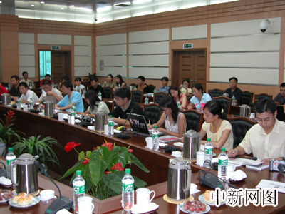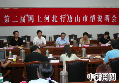 第二屆“網(wǎng)上河北行”采風(fēng)團(tuán)的記者們21日來(lái)到唐山市采訪,唐山市政府領(lǐng)導(dǎo)召開市情說(shuō)明會(huì)向記者介紹了唐山現(xiàn)狀。圖為說(shuō)明會(huì)現(xiàn)場(chǎng)。(秦欣攝)
