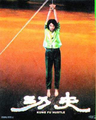 雖然片名是《功夫》,但海報(bào)中的星爺卻并沒以武林高手形象出現(xiàn),反見穿西褲、T恤衫的星爺不但臉容憔悴,且被一條繩吊在半空之中,看似非常潦倒落泊。