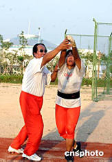 國家田徑隊(duì)女子鏈球組優(yōu)秀運(yùn)動(dòng)員顧原(右),二○○四年七月中旬在日照山東省體院訓(xùn)練基地緊張訓(xùn)練,備戰(zhàn)雅典奧運(yùn)會(huì)。圖為教練歐喜元(左)正在為顧原做技術(shù)指導(dǎo)。中新社記者:張勤