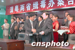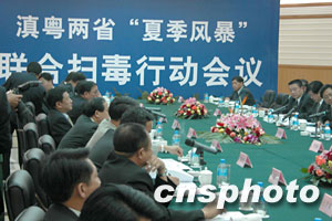 七月二十三日下午,滇粵兩省在昆明舉行“夏季風(fēng)暴”聯(lián)合掃毒行動(dòng)會(huì)議。由廣東省委副書記王華元及副省長李容根率領(lǐng)的廣東禁毒代表團(tuán),與中共云南省委常委李明朝、副省長李漢柏等就雙方建立合作機(jī)制進(jìn)行了深入的探討。兩省警方負(fù)責(zé)人還共同簽署了《滇粵兩省公安機(jī)關(guān)聯(lián)合開展打擊跨區(qū)域毒品犯罪專項(xiàng)行動(dòng)方案》和《滇粵兩省公安機(jī)關(guān)全面加強(qiáng)緝毒辦案合作協(xié)議》。此舉標(biāo)志著兩省禁毒合作新機(jī)制的全面啟動(dòng)。按照協(xié)議,兩省將全面加大緝毒情報(bào)交流和辦案執(zhí)法合作力度,組織偵破一批高質(zhì)量、跨區(qū)域、有組織的制販毒案件并將建立若干合作機(jī)制。王華元表示,為加強(qiáng)禁毒工作,廣東省將于近期成立禁毒工作局,增加禁毒力量,并將在各地成立禁毒支隊(duì)。與此同時(shí),還將動(dòng)員全社會(huì)的力量嚴(yán)厲打擊毒品犯罪活動(dòng)。中新社納家驊/攝