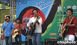 宏利人壽臺(tái)灣公司、臺(tái)北愛(ài)樂(lè)電臺(tái)等攜手制作出由花蓮縣“太平國(guó)小布農(nóng)兒童合唱團(tuán)”演唱的CD。CD義賣所得,將捐給臺(tái)癌癥希望協(xié)會(huì)。圖為四名原住民成人歌手,為推動(dòng)CD義賣在街頭落力演唱。中新社記者:董會(huì)峰
