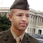亨德森現(xiàn)年29歲,是駐美加州長灘第3海航炮火聯(lián)絡(luò)連的一名后備役軍人,他于去年參加了美國對伊拉克的戰(zhàn)爭。在影片中,他與導(dǎo)演摩爾在美國國會大廈外有這樣一段對話: