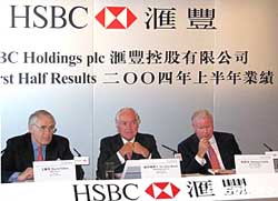 香港匯豐銀行8月2日在香港發(fā)表2004年中期業(yè)績,(左起)匯豐亞太區(qū)主席艾爾敦、匯豐集團主席龐約翰、行政總裁邵銘高等為記者解答提問。作者:李炘