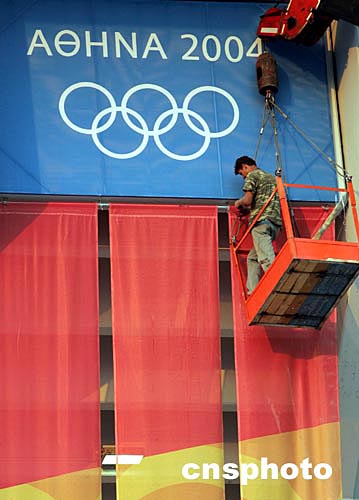 當?shù)貢r間8月3日晚,一名建筑工人在雅典奧運會主體育場安裝加固旗幟,開幕式將于8月13日在這里舉行。中新社記者:任晨鳴