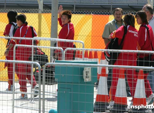 當(dāng)?shù)貢r(shí)間8月6日下午,參加雅典奧運(yùn)會(huì)的中國(guó)女足抵達(dá)雅典,隊(duì)員畢妍在嚴(yán)密的保衛(wèi)下向遠(yuǎn)在隔離線(xiàn)外的記者招手。中新社記者:任晨鳴